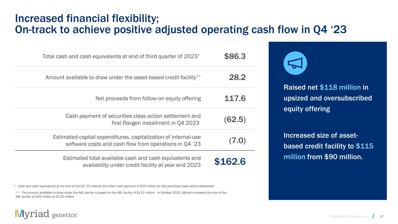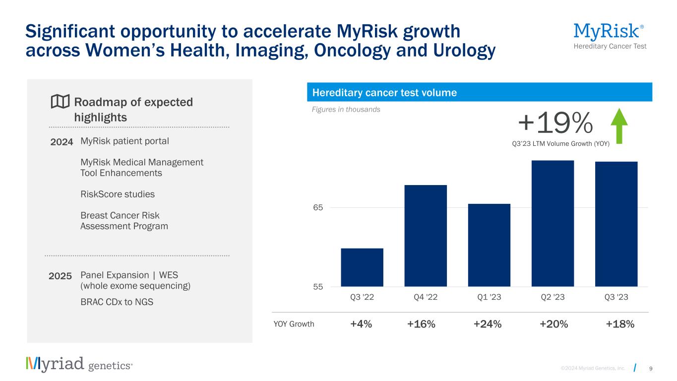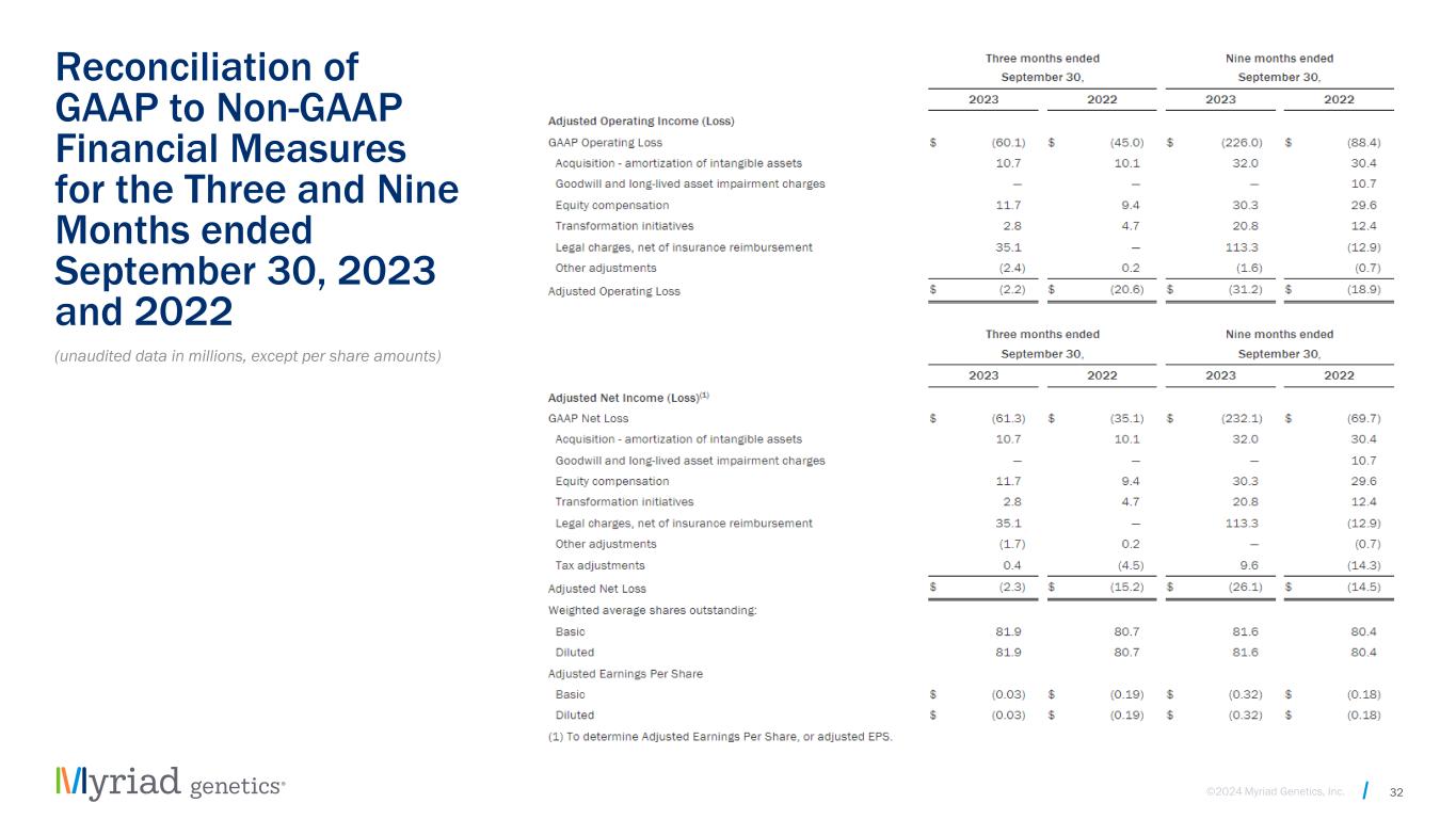 This Current Report on Form 8-K and Exhibit 99.1 contain “forward-looking statements” within the meaning of the Private Securities Litigation Reform Act of 1995, including, but not limited to, the Company’s fiscal year 2023 financial guidance, preliminary fourth quarter 2023 financial and operating results, 2024 revenue guidance and long-term financial targets through 2026, the Company’s expectation to achieve positive adjusted operating cash flow in the fourth quarter of 2023, the Company's expectation of 10%+ revenue growth in 2024 through 2026, the Company’s estimated total available cash and credit at year end 2023, roadmaps of expected business highlights in 2024 and 2025, the expected timeline to complete certain enterprise infrastructure and capability investments, and the expected timing of the launch or enhancement of certain new or existing products. These “forward-looking statements” are management’s present expectations of future events as of the date hereof and are subject to a number of known and unknown risks and uncertainties that could cause actual results, conditions, and events to differ materially and adversely from those anticipated. These risks include, but are not limited to: the risk that sales and profit margins of the Company’s existing tests may decline or that the Company may not be able to operate its business on a profitable basis; risks related to the Company’s ability to achieve certain revenue growth targets and generate sufficient revenue from its existing product portfolio or in launching and commercializing new tests to be profitable; risks related to changes in governmental or private insurers’ coverage and reimbursement levels for the Company’s tests or the Company’s ability to obtain reimbursement for its new tests at comparable levels to its existing tests; risks related to increased competition and the development of new competing tests; the risk that the Company may be unable to develop or achieve commercial success for additional tests in a timely manner, or at all; the risk that the Company may not successfully develop new markets or channels for its tests, including the Company’s ability to successfully generate substantial revenue outside the United States; the risk that licenses to the technology underlying the Company’s tests and any future tests are terminated or cannot be maintained on satisfactory terms; risks related to delays or other problems with constructing and operating the Company’s laboratory testing facilities; risks related to public concern over genetic testing in general or the Company’s tests in particular; risks related to regulatory requirements or enforcement in the United States and foreign countries and changes in the structure of the healthcare system or healthcare payment systems; risks related to the Company’s ability to obtain new corporate collaborations or licenses and acquire or develop new technologies or businesses on satisfactory terms, if at all; risks related to the Company’s ability to successfully integrate and derive benefits from any technologies or businesses that it licenses, acquires or develops; the risk that the Company is not able to secure additional financing to fund its business, if needed, in a timely manner or on favorable terms, if it all; risks related to the Company’s projections or estimates about the potential market opportunity for the Company’s current and future products; the risk that the Company or its licensors may be unable to protect or that third parties will infringe the proprietary technologies underlying the Company’s tests; the risk of patent-infringement claims or challenges to the validity of the Company’s patents; risks related to changes in intellectual property laws covering the Company’s tests, or patents or enforcement, in the United States and foreign countries; risks related to security breaches, loss of data and other disruptions, including from cyberattacks; risks of new, changing and competitive technologies in the United